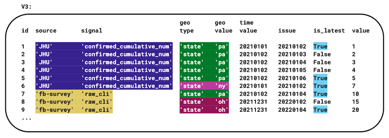 • Because v3 recorded which row represented the most up-to-date value among a set of revisions using a flag, this flag had to be meticulously maintained to ensure that exactly one row for each (source, signal, time_type, time_value, geo_type, geo_value) tuple had the is_latest flag set. This flag had to be unset when newer data was added, but left in place when older data was patched. System faults while data was being loaded could leave the records in an inconsistent state where two or more, zero, or the wrong rows had the flag set. Detecting problems with this flag was computationally expensive.