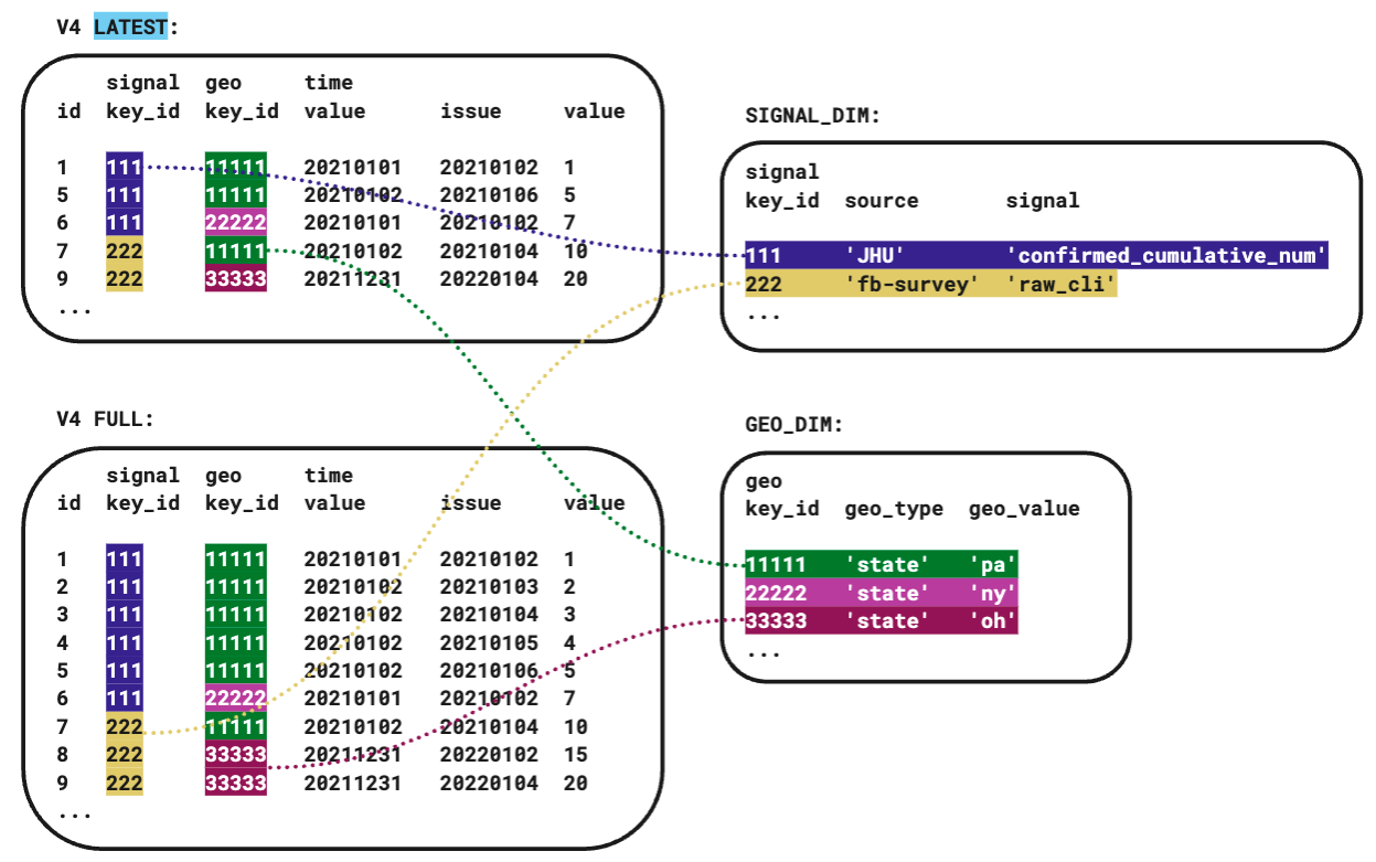 • The v3 table included the full text of the source, signal, geographic type, and geographic value for each row, such that we were storing millions of copies of identical information for rows that shared the same (source, signal, geo_type, geo_value). Since the duplicated information was also the most common selection criteria, the indexes took up a disproportionate amount of space on disk relative to the size of the base dataset.