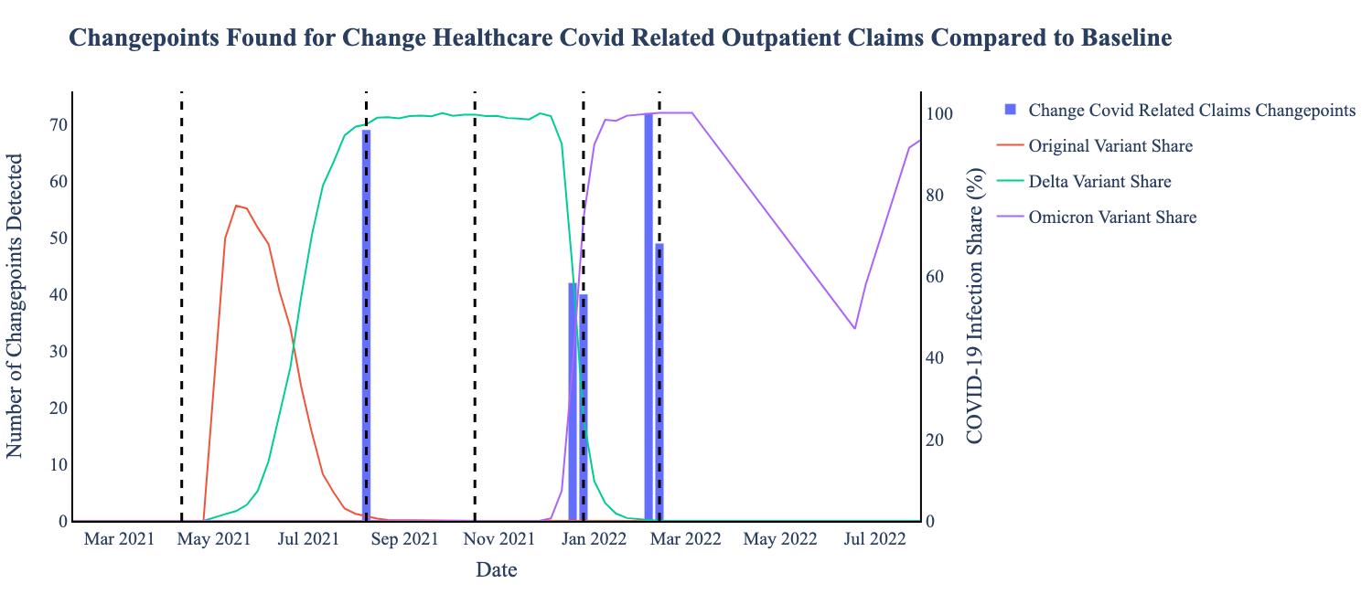 Figure 1. Total and Variant Case Counts with variant changepoints on April 24, 2021; June 19, 2021; December 18, 2021; March 5, 2022; June 18, 2022.